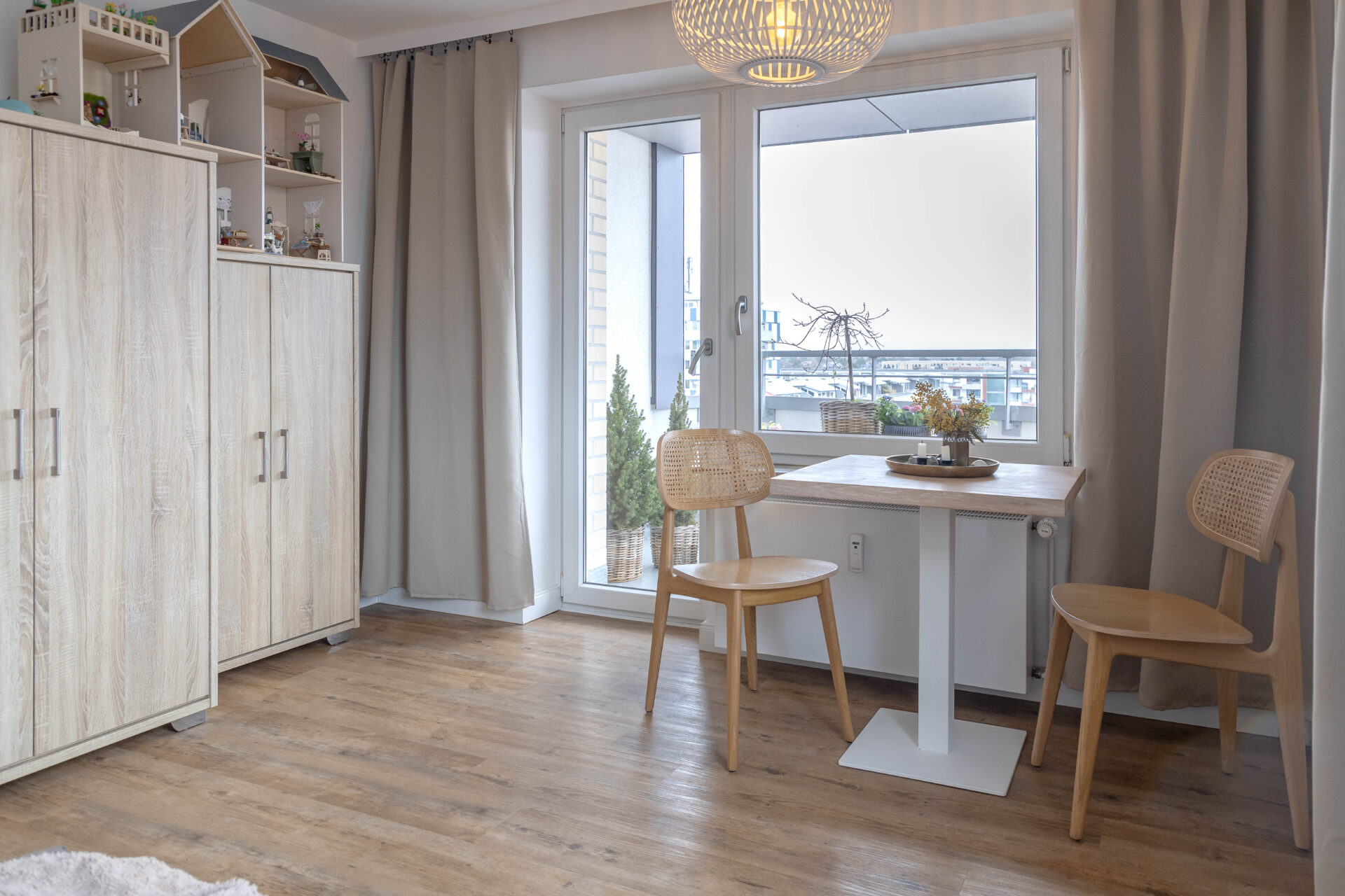 Der helle Wohnbereich überzeugt mit stilvoller Möblierung, Essplatz, Schlafsofa.