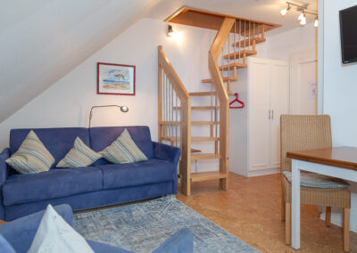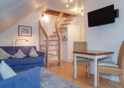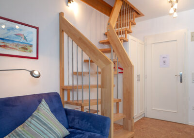 Eine elegante Treppe führt in die obere Ebene – ein zusätzlicher Rückzugsraum unter dem Dach, der dem Appartement eine besondere räumliche Tiefe verleiht.