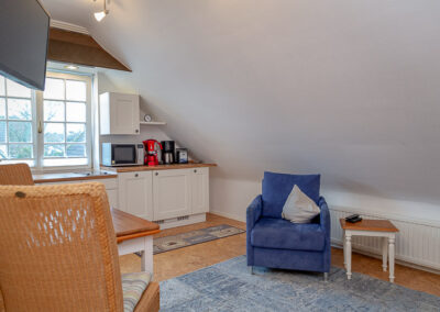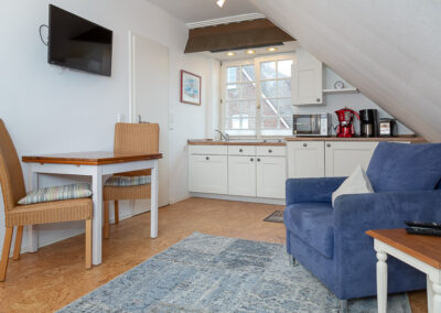 Der Wohnbereich öffnet sich unter den charakteristischen Gaubenfenstern mit klassischen Sprossen – ein architektonisches Highlight, das dem Raum Licht, Weite und unverwechselbaren friesischen Charme verleiht.