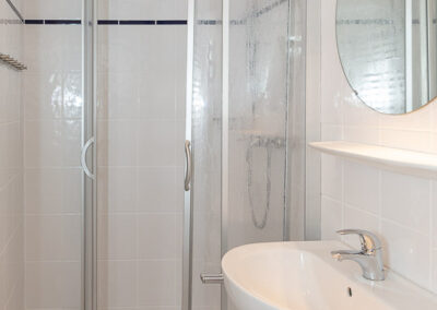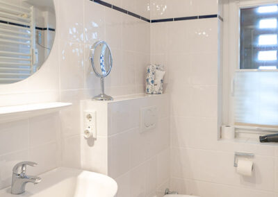 Maßgefertigte Tischlerarbeiten und integrierte Einbauten sorgen für eine klare Linienführung und maximalen Komfort. Das Badezimmer präsentiert sich modern und zurückhaltend mit hochwertigen Materialien, durchdachter Funktionalität und feinen Details.