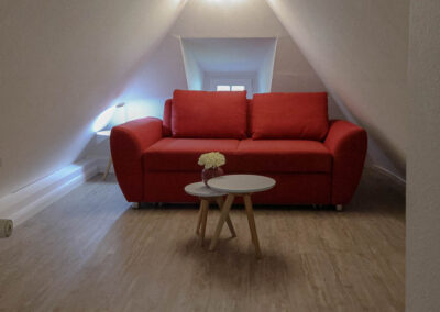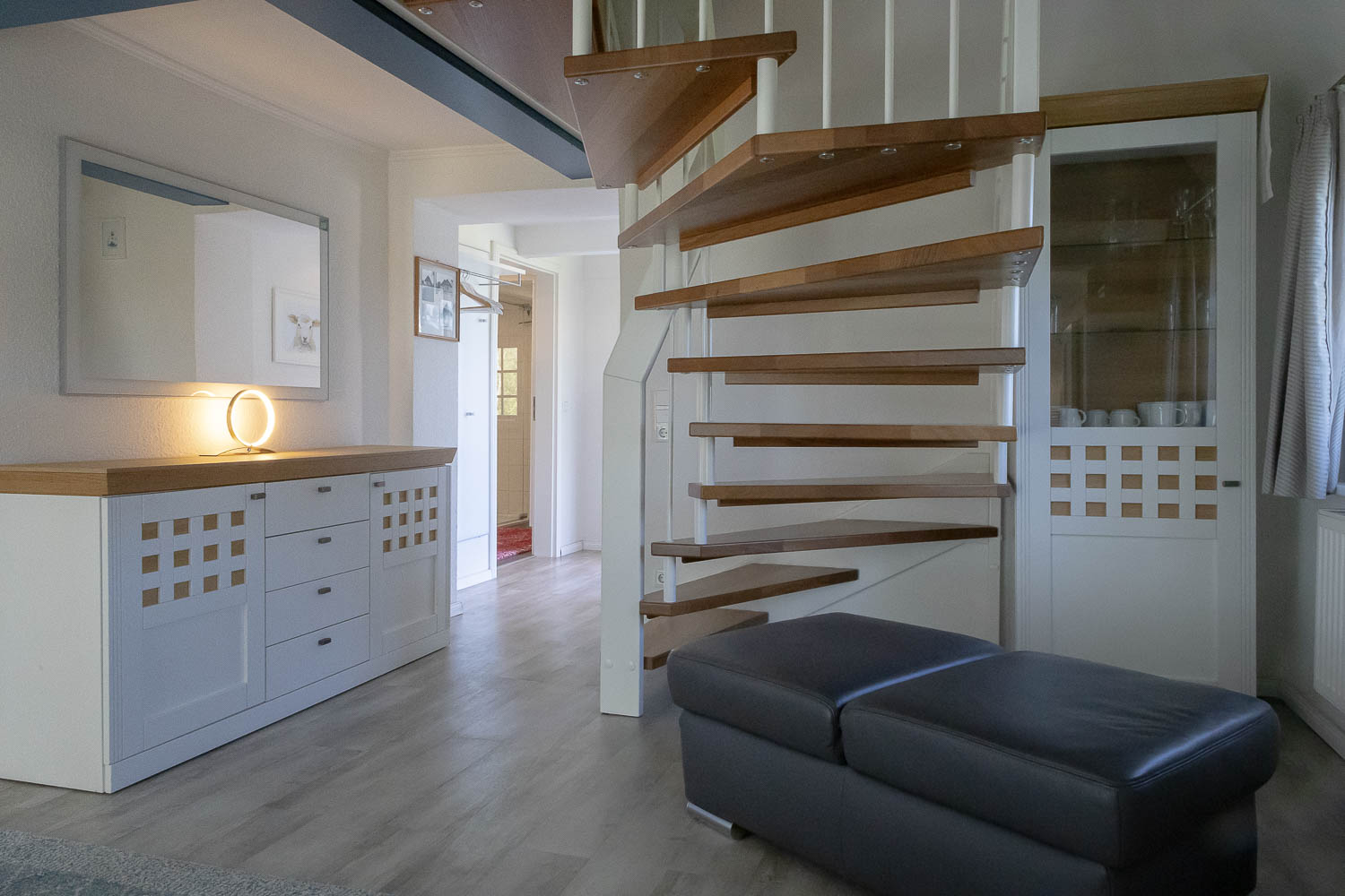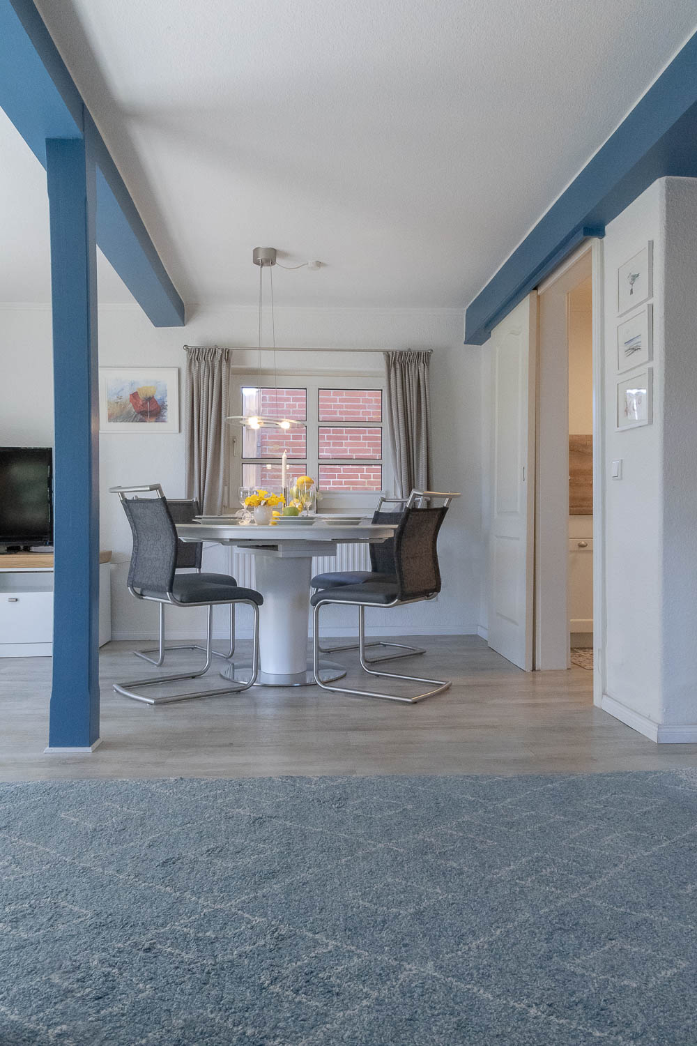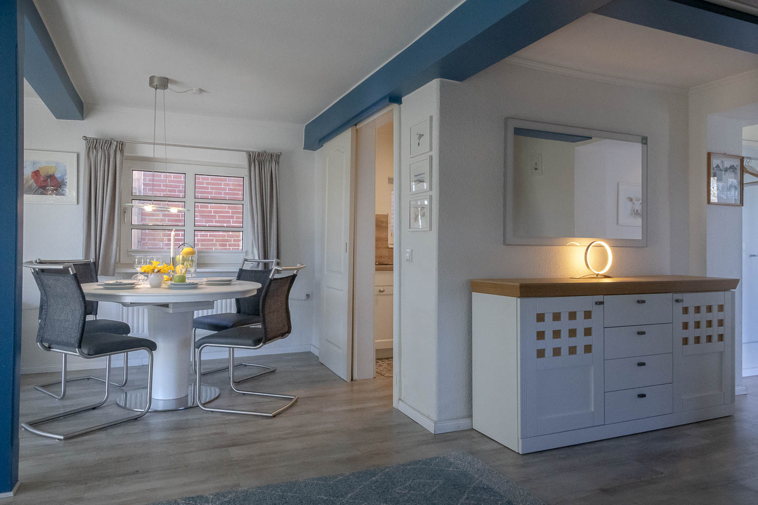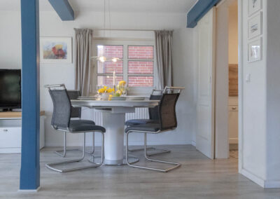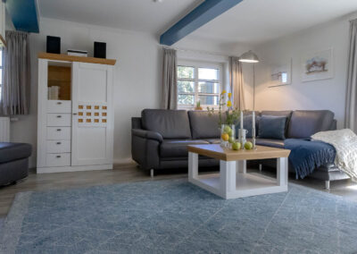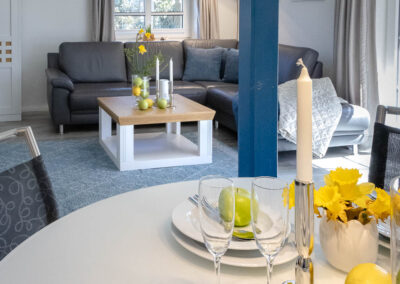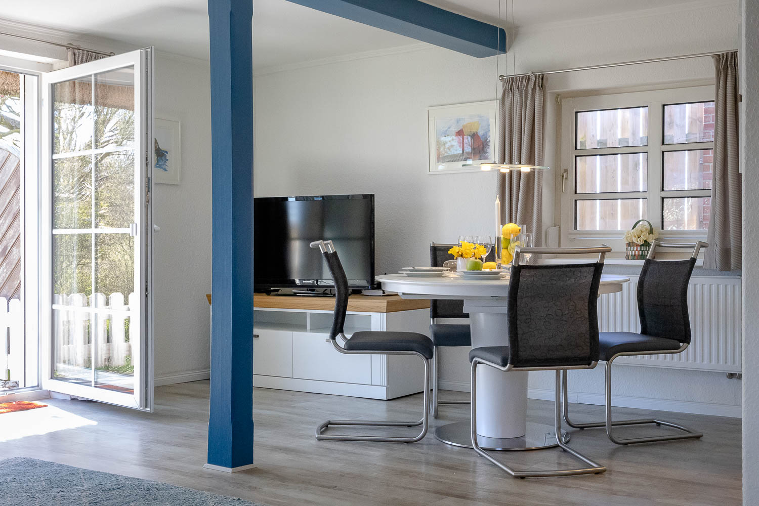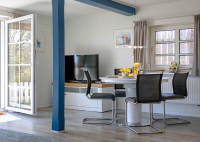 Das Herzstück des Hauses ist der großzügige, allseitig verglaste Wohnbereich: lichtdurchflutet, ruhig, mit Sitzgruppe, Esstisch, Leseecke und Flachbild-TV mit Satellitenempfang. Der Übergang zur möblierten Südterrasse ist fließend – windgeschützt, mit Gartenblick und Grillmöglichkeit, konzipiert zum Verweilen.