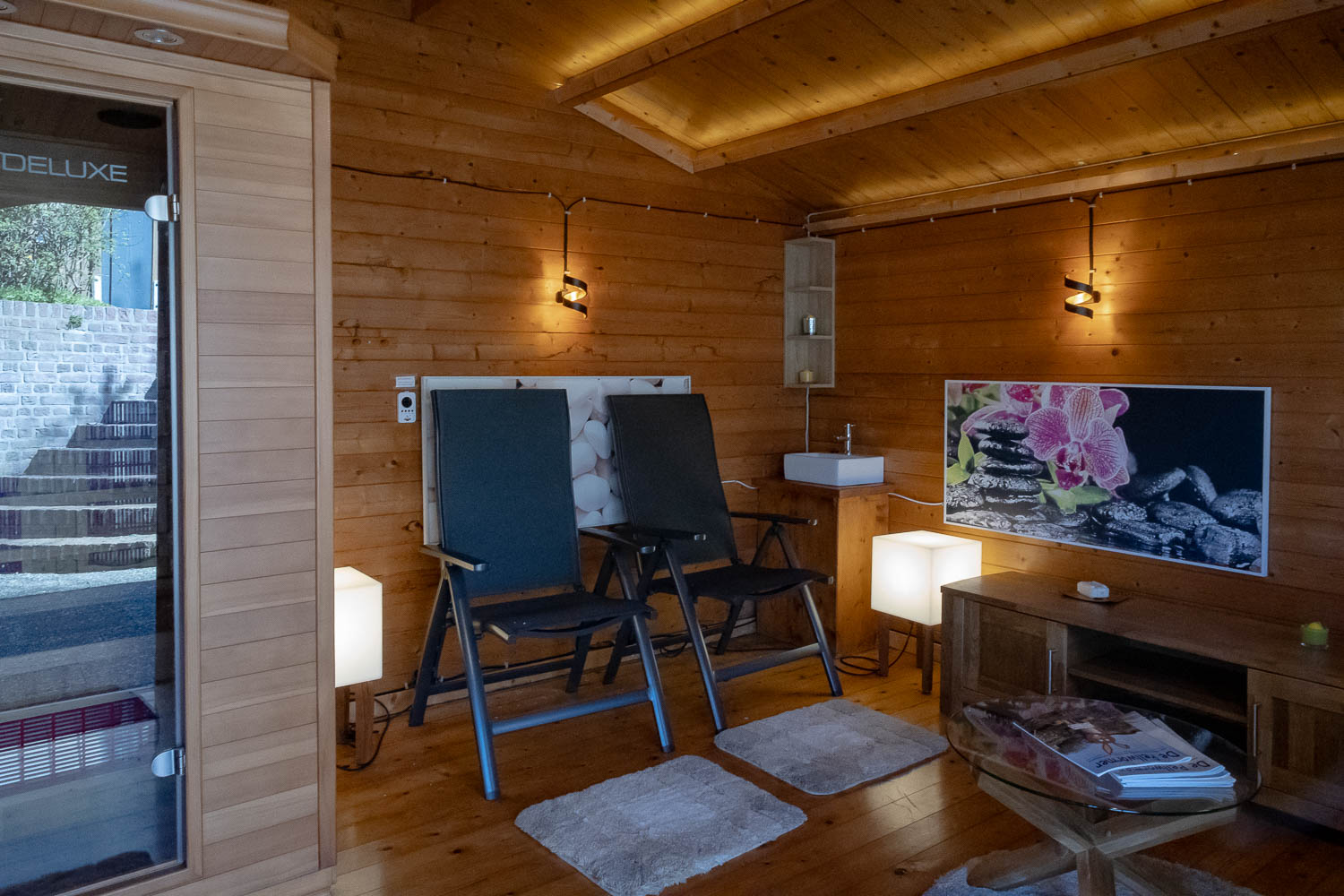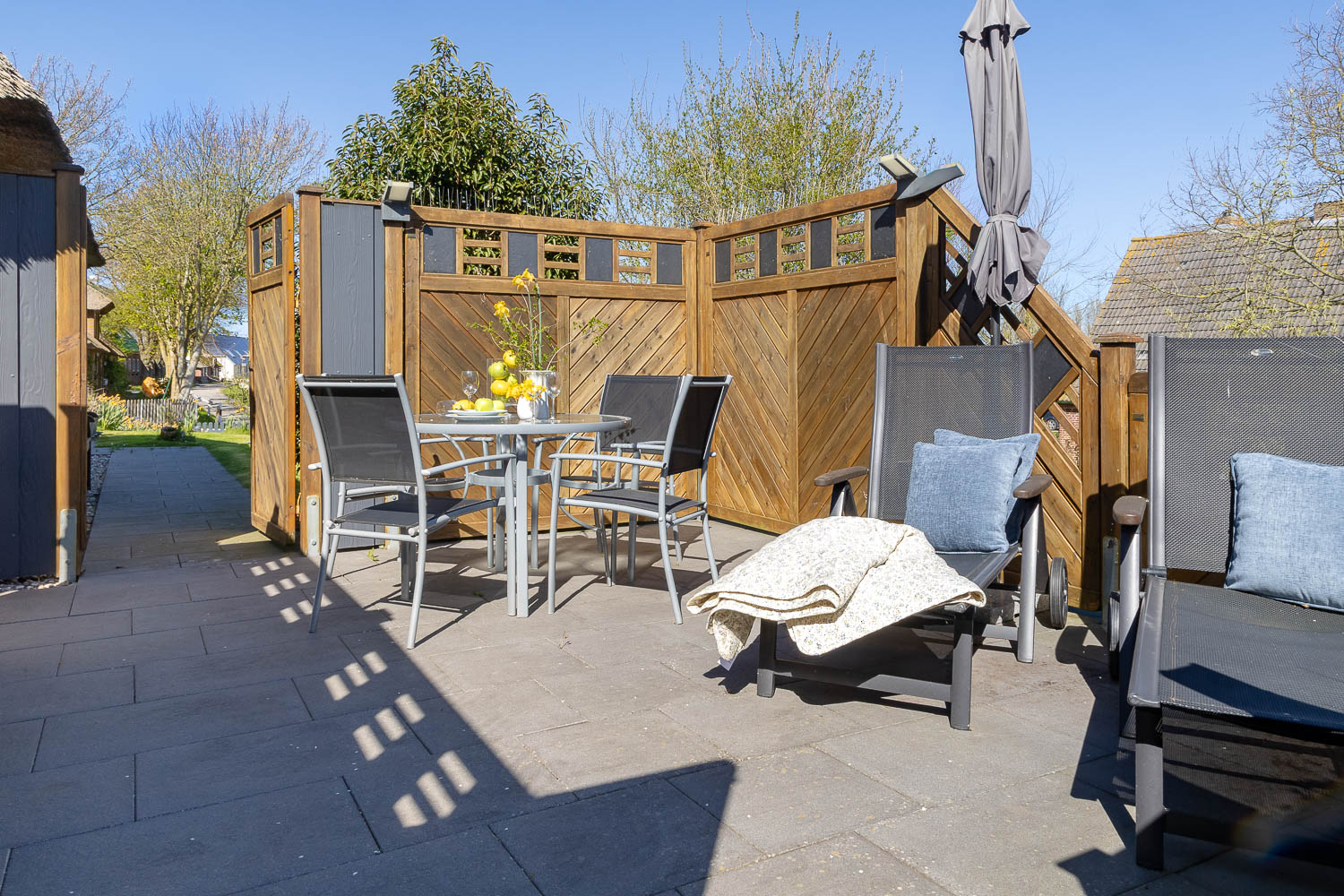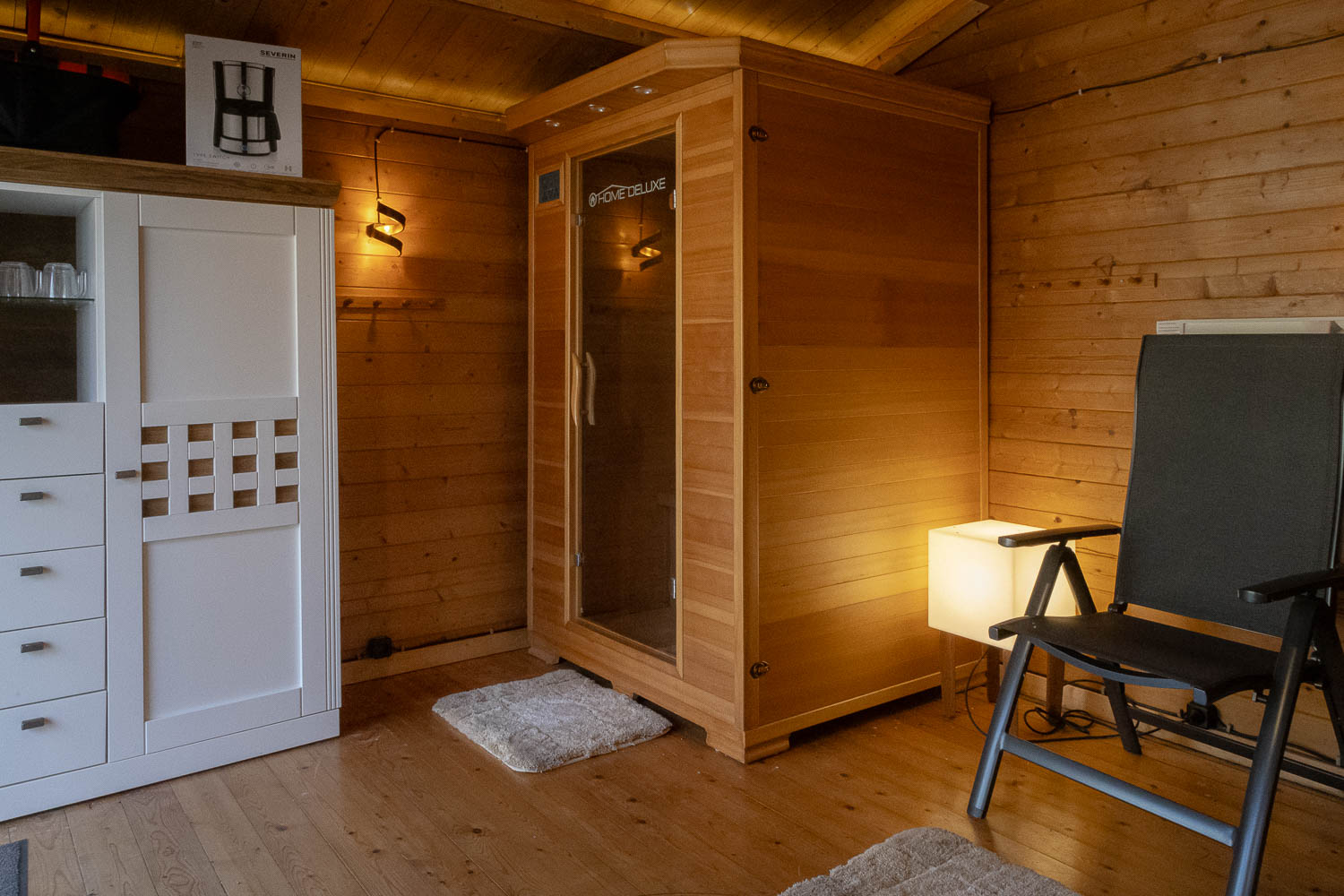Separat auf dem Grundstück gelegen, ergänzt ein eigenes Blockhaus das Angebot mit Infrarotsauna und beheiztem Liegebereich für zwei Personen. Gerade an kühleren Nordseetagen ist dieser Rückzugsort kein Komfortdetail – sondern der Mittelpunkt des Abends.