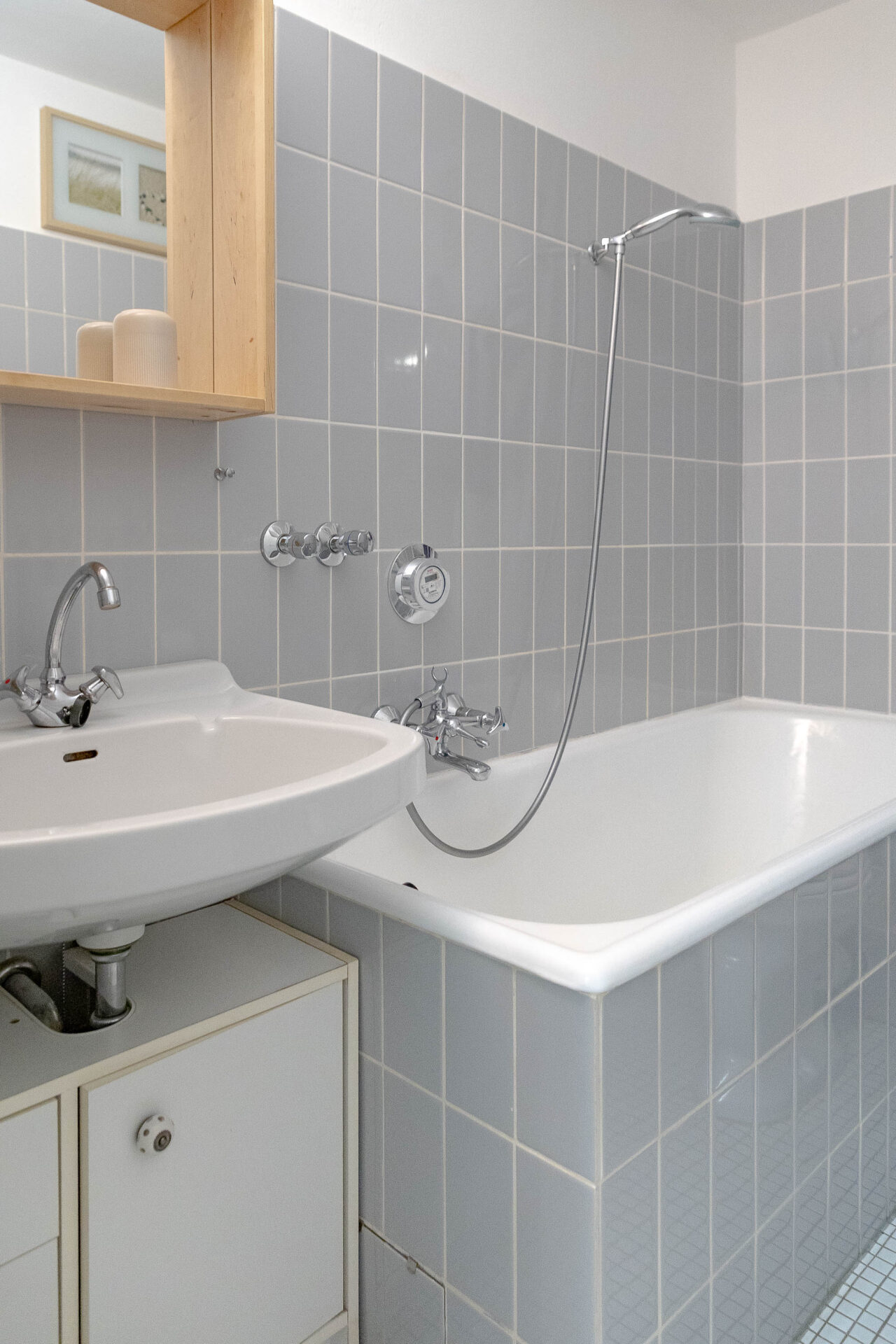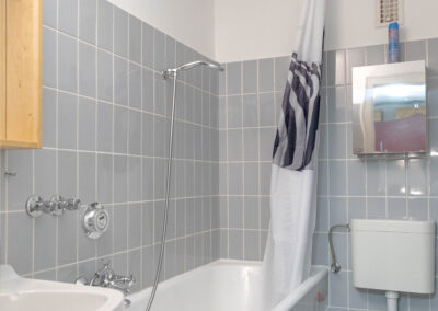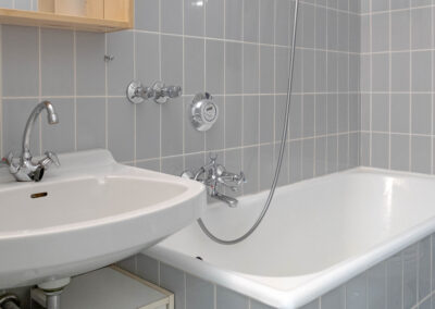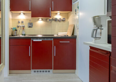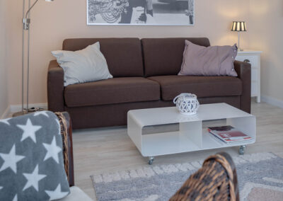 Das Appartement (ca. 30qm) eignet sich hervorragend für 1–2 Personen. Es verfügt über einen modernen, pflegeleichten Designboden in Holzoptik. Der Wohnraum bietet Platz für einen Essbereich, ein Schlafsofa sowie einen geräumigen Kleiderschrank. Im Eingangsbereich ist eine kompakte, praktische Küchenzeile integriert.