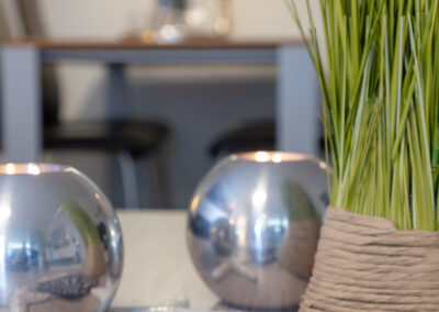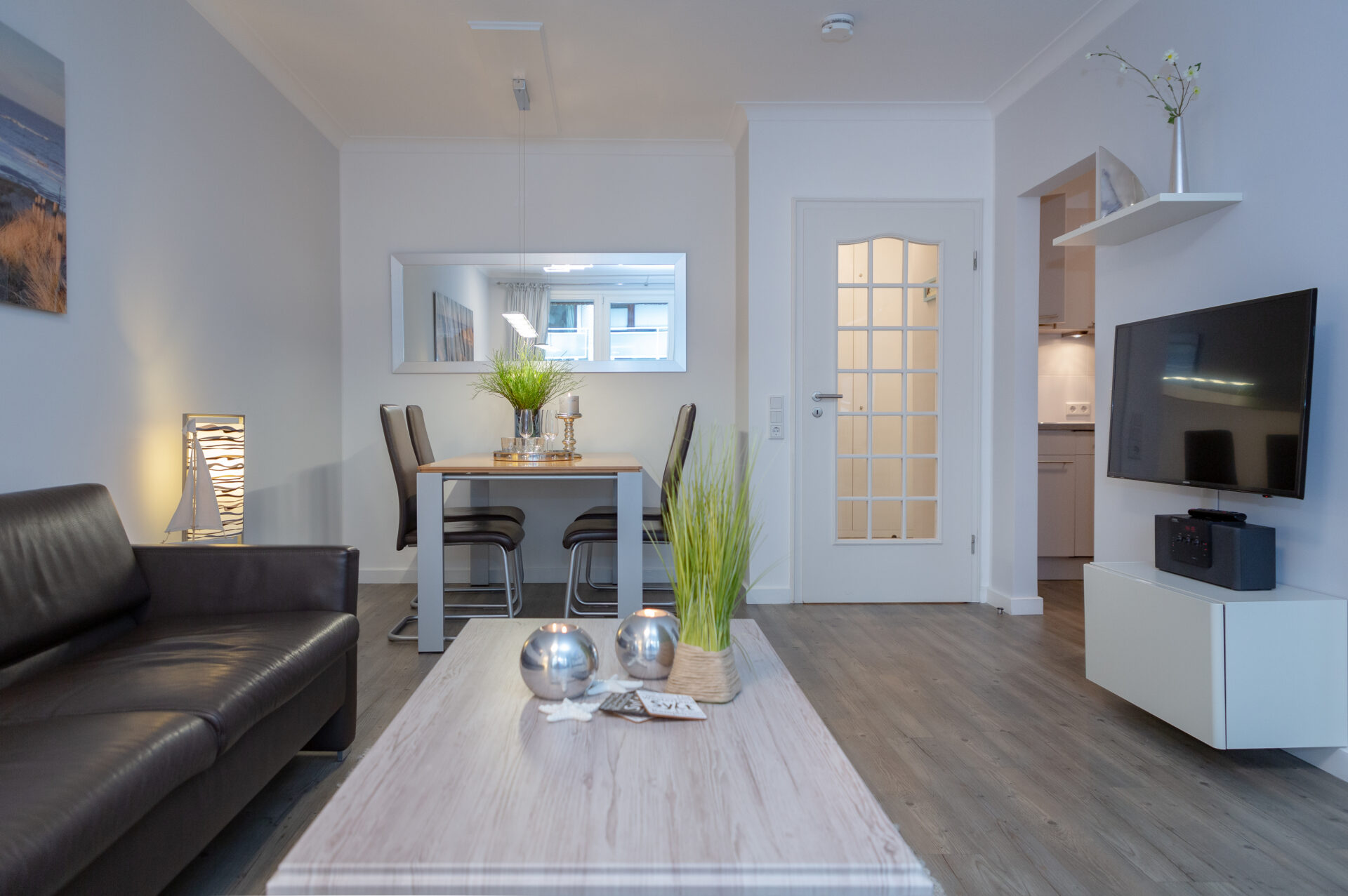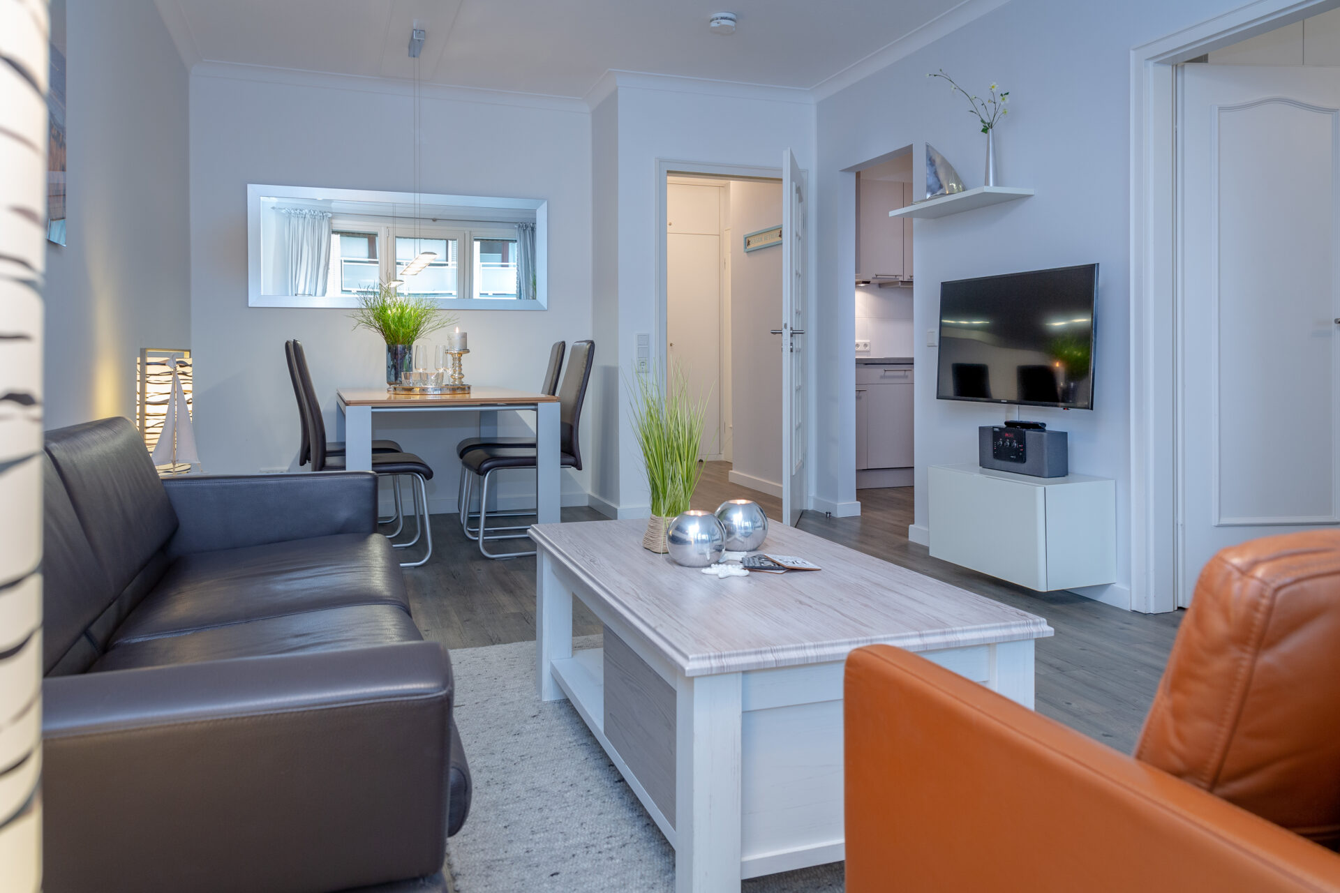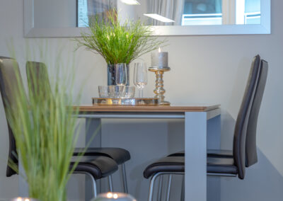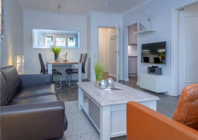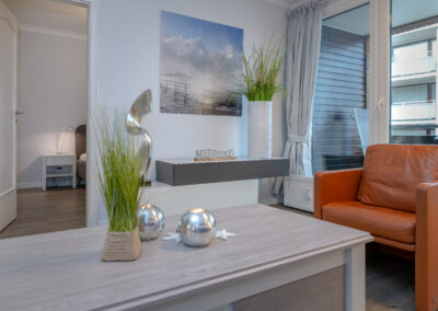 Im Mittelpunkt steht der Wohnbereich mit elegantem Designboden in Grau, stilvoller Möblierung und harmonisch integriertem Essplatz. Die windgeschützte Loggia zur Friedrichstraße eröffnet einen kleinen Blick zur Nordsee und schafft einen geschützten Außenbereich mit besonderem Flair – ideal für entspannte Stunden nach einem Strandspaziergang.