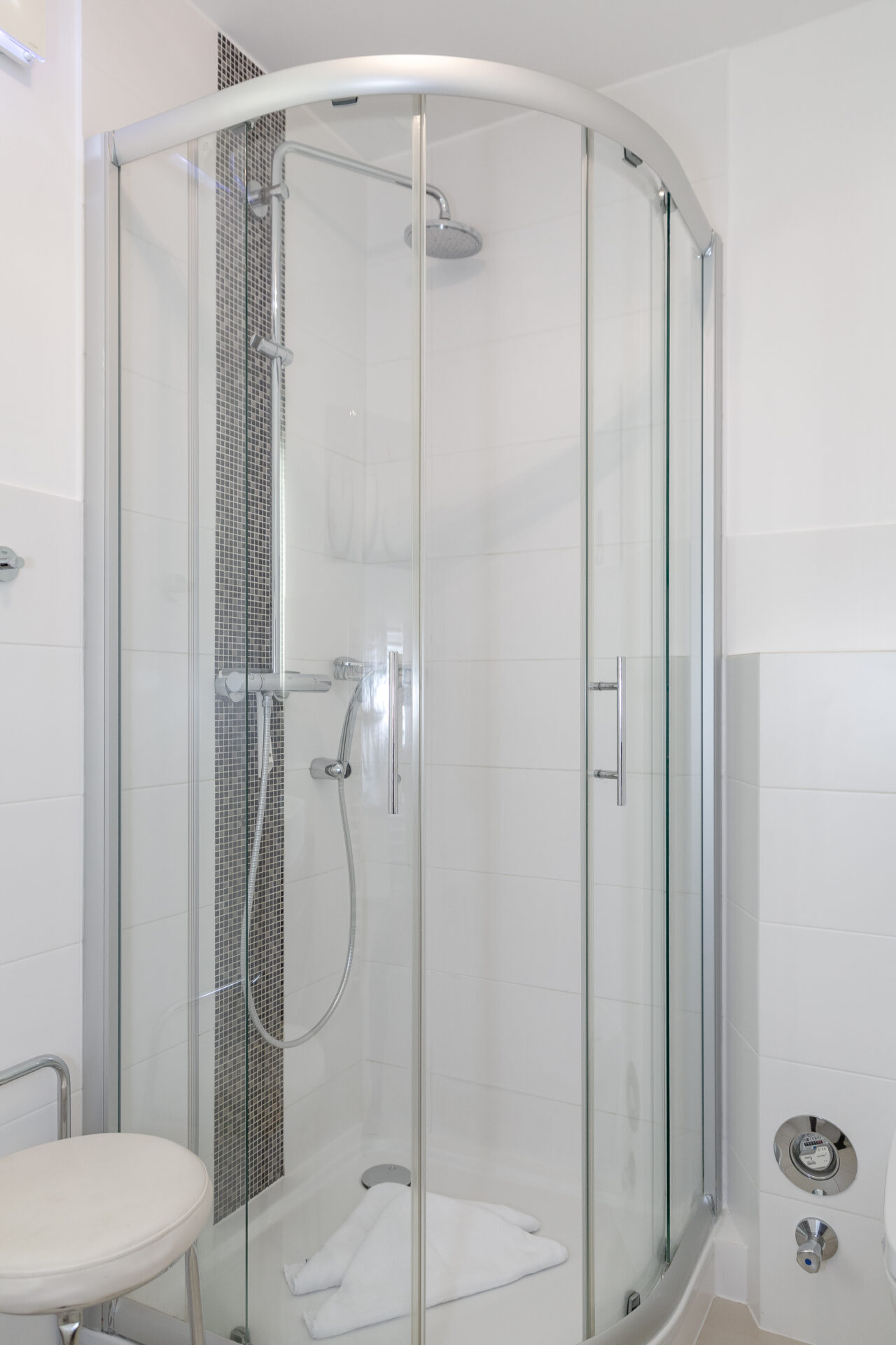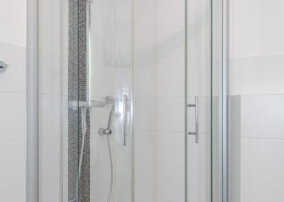 Der Eingangsbereich mit integriertem Einbauschrank sorgt für einen repräsentativen Empfang. Das geschmackvoll erneuerte Duschbad überzeugt mit hochwertiger Ausstattung und ebenerdiger Regendusche – modern, zeitlos und komfortabel.