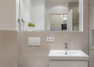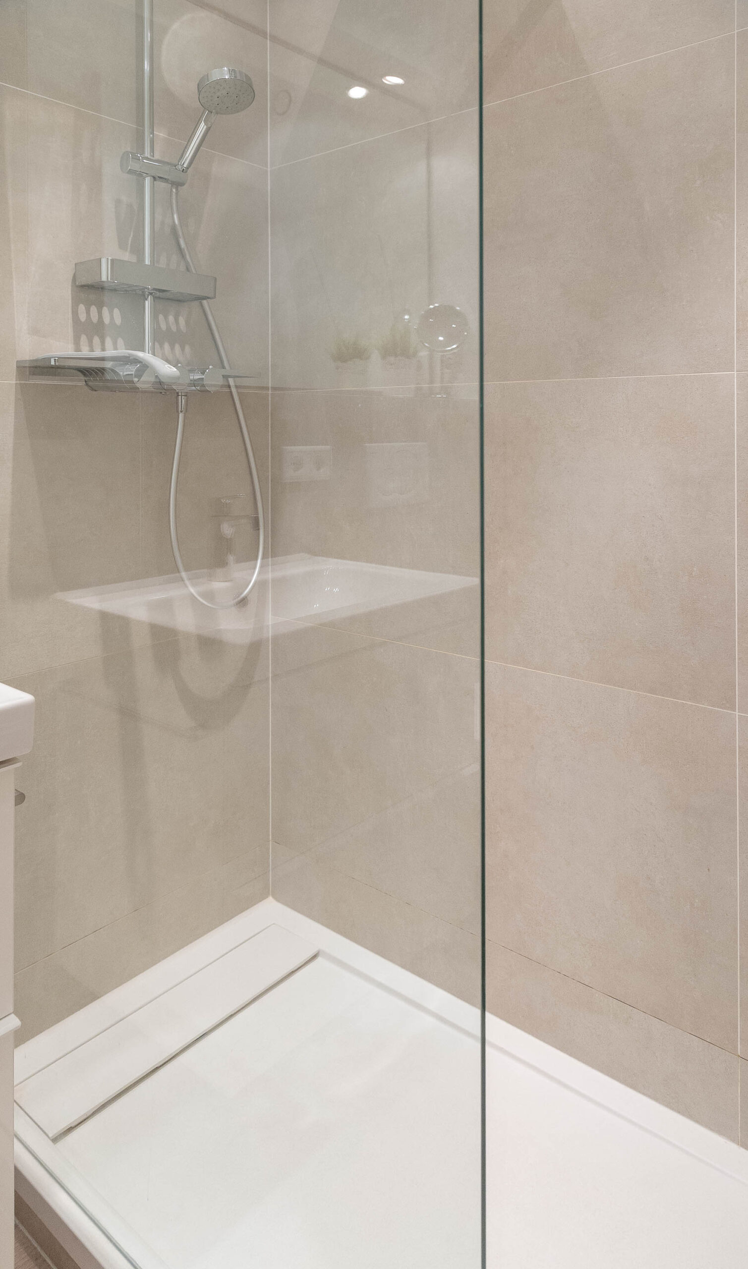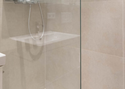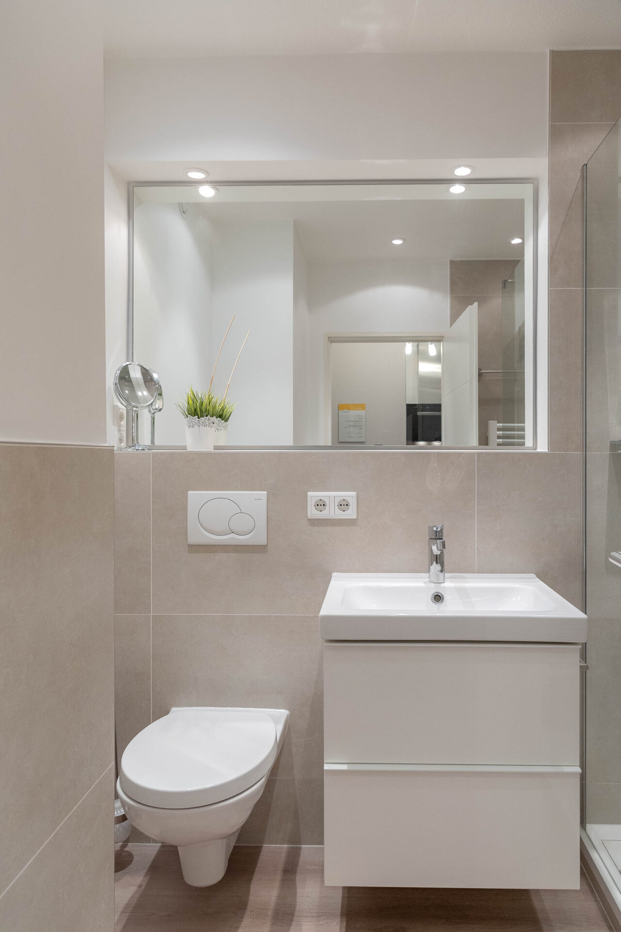 Die offene Einbauküche ist ein weiteres Highlight: Sie ist modern, voll ausgestattet und lässt keine Wünsche offen. Das Tageslichtbad beeindruckt mit einer großzügigen Walk-In-Dusche und zeitgemäßem Design.