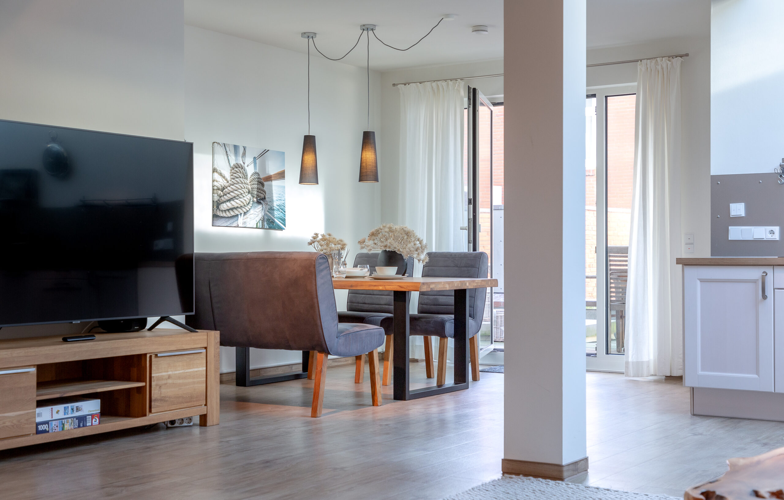 Heller, großzügiger Wohnraum mit Essecke und Loungebereich